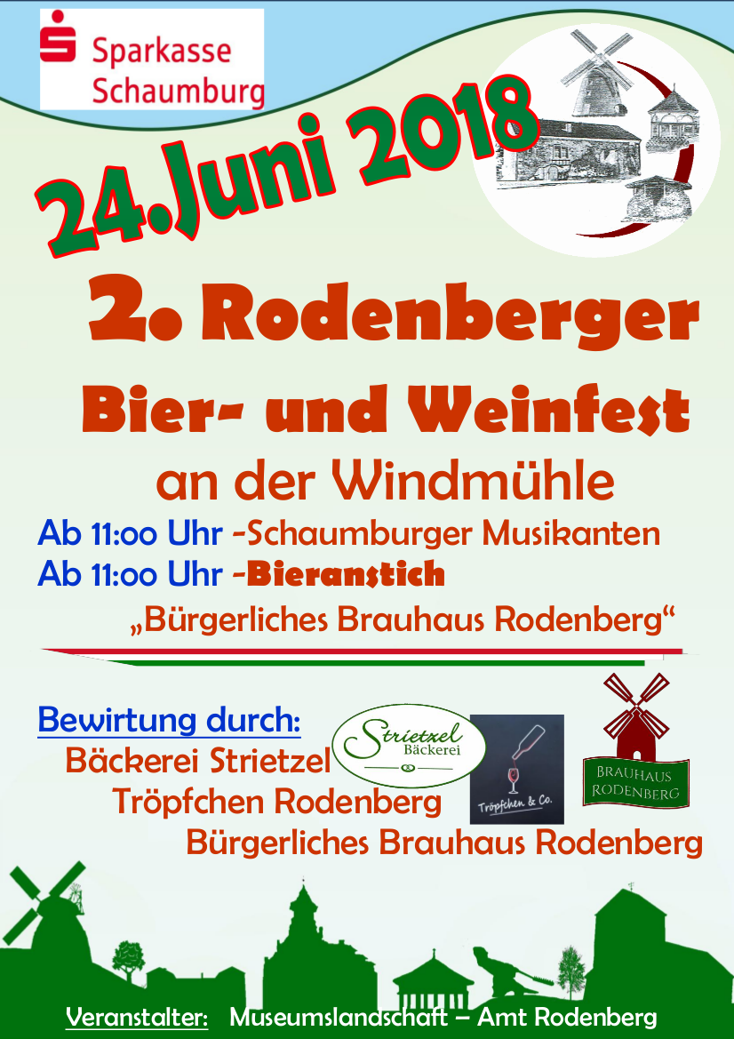 Schon mal vormerken: Am 24.06.2018 findet das zweite Rodenberger Bier- und Weinfest an der Windmühle statt. Eingeladen sind alle, die leckeres Bier vom Rodenberger Brauhaus mögen und/oder auch Kaffee und Kuchen vom Bäcker Strietzel. Neben anderen Leckereien gibt es auch was für die Ohren ….