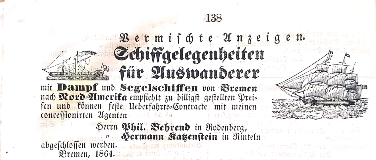 In dem „Wochenblatt für die Grafschaft Schaumburg“ vom 24. März 1864 fand ich nachstehende Anzeige des Rodenbergers Phil. Behrend.