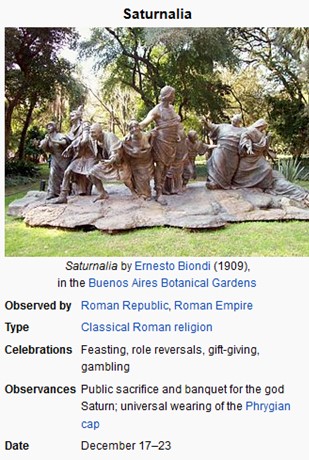 die Saturnalien zu Ehren des Saturns,dem legendären ersten König von Latium. Er soll den Ackerbau eingeführt haben. Zu den Feierlichkeiten gehörte die Opferung eines jungen Schweines im Tempel des Saturns auf dem Forum, ein Essen auf Staatskosten, Gerichte, Schulen, Laden… hatten geschlossen, auch die Sklaven waren an dem Tag frei und wurden von ihren Herren bedient. Auf dem Saturnalienmarkt kaufte man dünne Wachskerzen, Wachs- oder Tonpüppchen und verschenkte sie mit guten Wünschen.