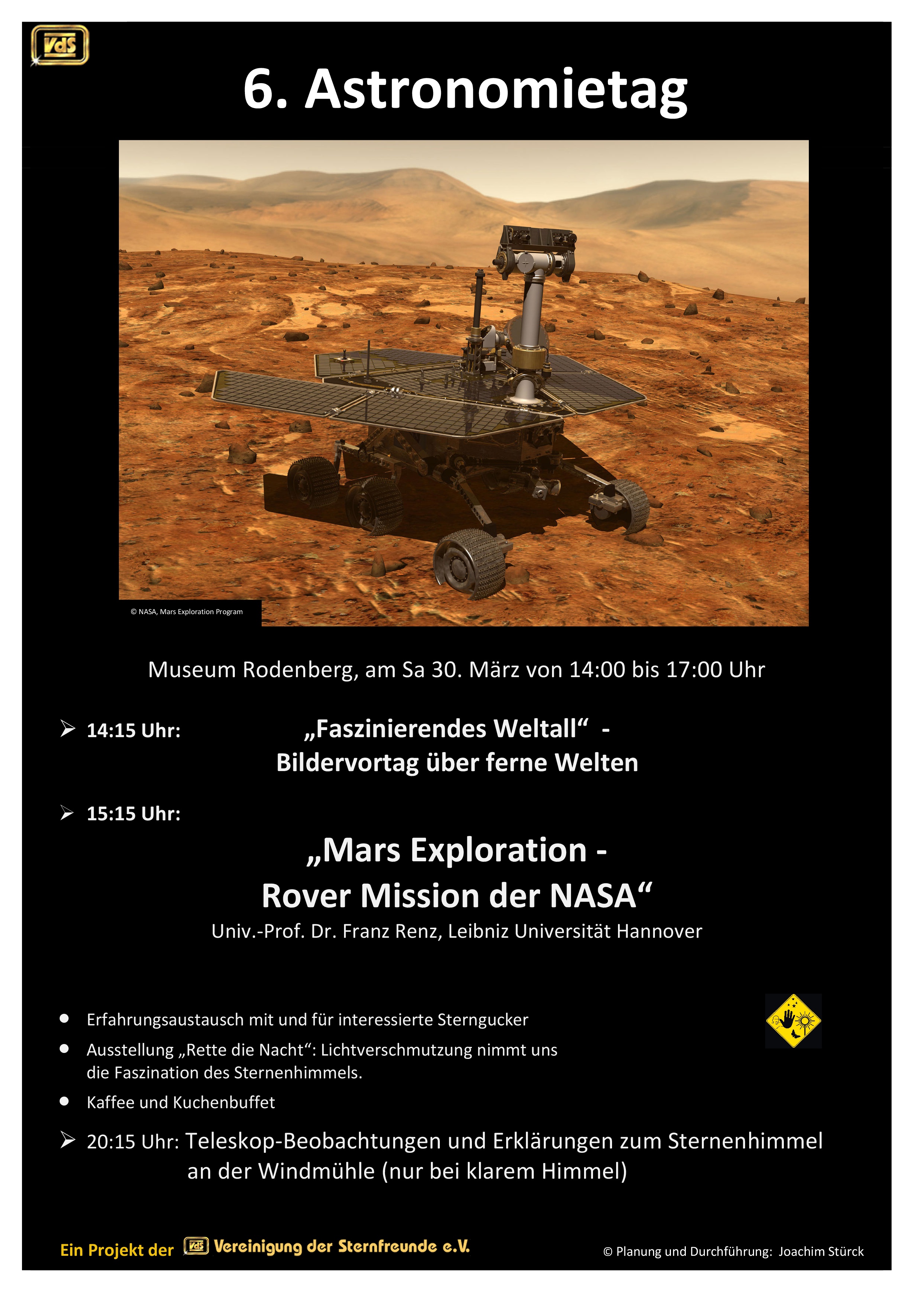 Um 15:15 Uhr berichtet Univ.-Prof. Dr. Franz Renz (Institut f. Anorganische Chemie der Leibniz Universität Hannover), über die Entdeckungen auf dem Mars der letzten 15 Jahre. Er ist Mitglied Mars Exploration Rover Mission der NASA und entwickelte im Auftrag der Universität Hannover wissenschaftlicher Analysegeräte für die Marsrover Spirit und Opportunity, die seit über 5000 Marstagen auf dem Mars im Einsatz waren.