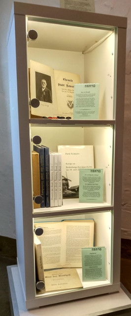 In einer neuen Stele auf halber Treppe zur Empore ist eine kleine Ausstellung diesen Chronisten gewidmet. Alle erschienenen Werke und Auflagen sind mit kleinen Erläuterungen ausgestellt.