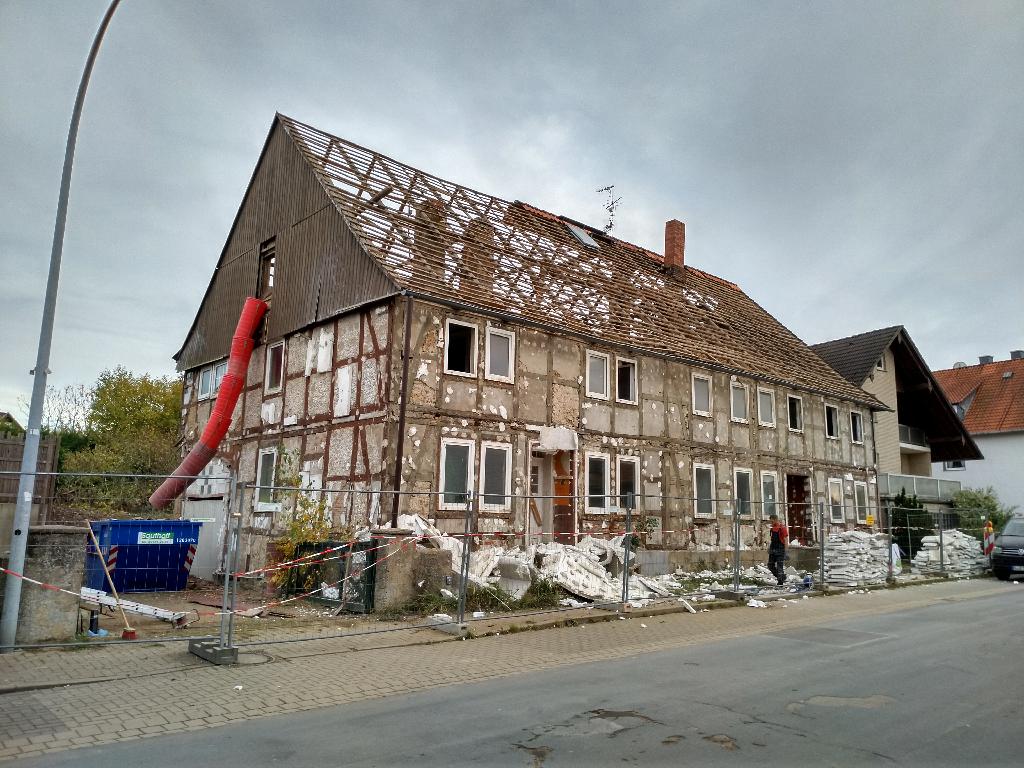 rgen geblieben: Der schon lange nicht mehr bewohnte „Schumacher-Hof“ wird aktuell für den Abriss vorbereitet. Nachdem der erst vor zwanzig Jahren aufgebrachten Isolierputz entfernt wurde kommt Fachwerk zutage, was auf ein älteres Baujahr schließen lässt. Tatsächlich ist der ursprünglich landwirtschaftliche – und später durch eine Transportunternehmen ergänzte – Betrieb um das Jahr 1800 erbaut worden.