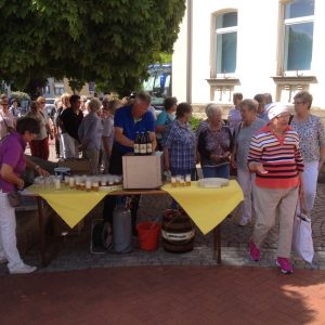 Nachdem die Barmstedter am Vormittag Bückeburg und das Schloss besichtigt hatten wurden sie auf dem Amtsplatz, neben dem Braumeister Kinkeldey, mit Bier aus dem Rodenberger Brauhaus begrüßt. Bürgermeister R. Sassmann und die Vorsitzenden der hiesigen Landfrauen M. Gellermann führten die Gäste in das Programm für den Nachmittag ein.