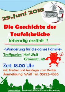 Ziel einer anschließenden kleinen Wanderung ist die Waldgaststätte Heisterburg, oder auch als „Teufelsbrücke“ bekannt. Dort erwartet die Teilnehmer auf einer Naturbühne ein Augen- und Ohrenschmaus, denn erzählt und gespielt wird die Geschichte um den Namen dieses sagenumwobenen Bauwerks. Der Pakt zwischen dem Teufel und dem Jäger Dagobert wird umrahmt von viel Musik und teuflischen Feuerwerk.