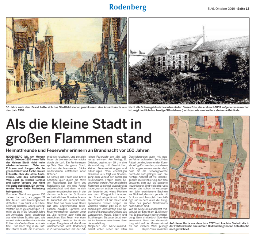 Die Museumslandschaft Amt Rodenberg e.V. und die Freiwillige Feuerwehr Rodenberg möchten gemeinsam an das Ereignis am 11. Oktober 2019 erinnern. Es soll dem Verlauf des Feuers mit Geschichten, kleinen Feuerwehrübungen und Erklärungen gefolgt werden.