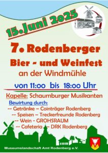 Sind Sie dabei wenn am 15.06.25 die Schaumburger Musikanten auf dem herrlichen Areal der Rodenberger Windmühle aufspielen. Um das leibliche Wohl kümmern sich in bewährter Weise Rodenbergs Cointräger und Treckerfreunde, ebenso wieder dabei für den feinen Gaumen Wein-GROHSRAUM und die DRK-Caféteria.
